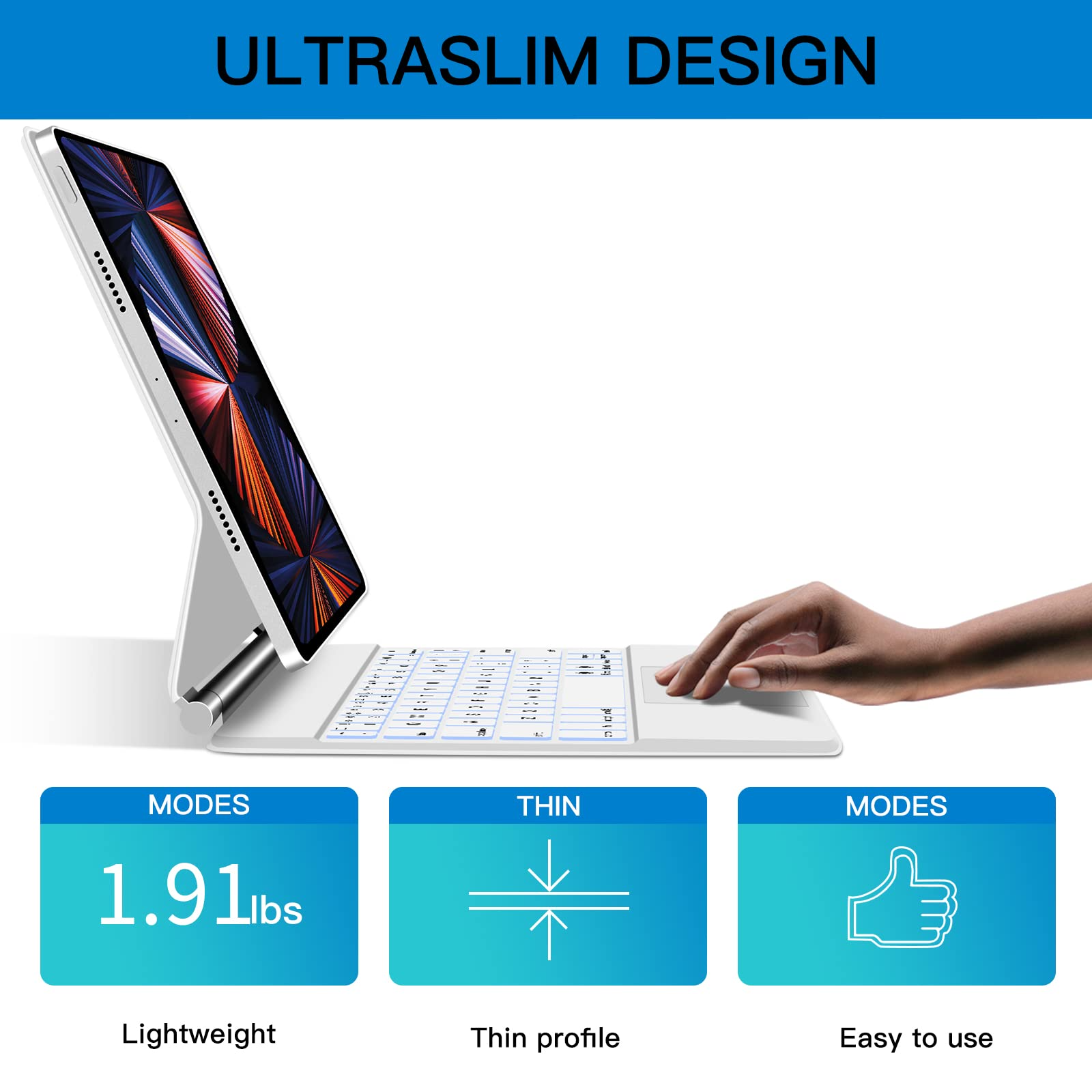 At just 1.45cm thick and 625g, this slim design is lighter and more stylish than the official Apple keyboard. The 7-color backlight with 3 brightness levels allows comfortable typing even at night. Continuous usage lasts up to 220 hours with backlight off and 6 hours with backlight on.